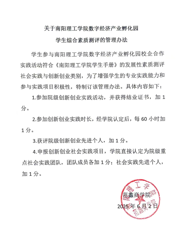2025年6月yl6809永利官网集团出台了《关于yl6809永利集团数字经济产业孵化园学生综合素质测评的管理办法》。