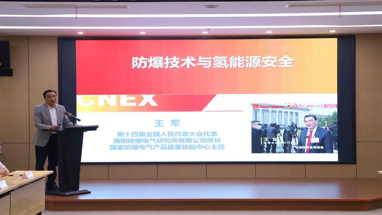 专家讲座环节上,南阳防爆电气研究所所长王军做了《防爆技术与氢能源安全》主题报告,结合全国防爆电驱产业发展现状系统分析了南阳防爆电驱产业的优势、特点和短板,提出了关注全球脱碳进程中的氢能战略,聚焦氢能“大潮”中南阳防爆电驱产业创新升级,开展氢能防爆产品标准研究制定和氢能防爆产品认证研究等建议,为南阳防爆电驱产业发展谋求新思路。