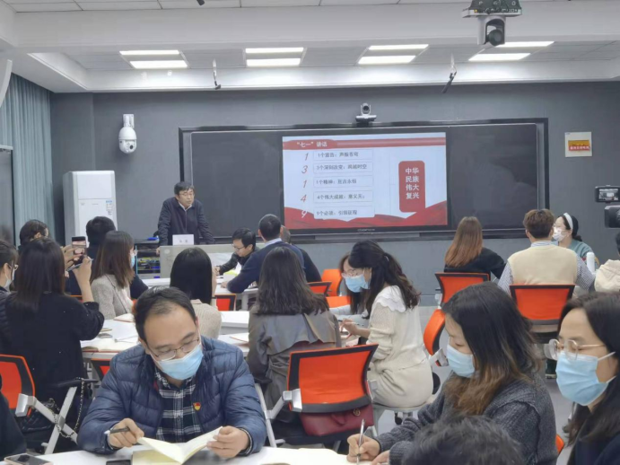 第三个层面是教师各支部组织学习,其中第二教师党支部邀请党委书记张良上党课,他强调:要学习十九届六中全会精神,强调作为教育工作者,要深入学习贯彻党的十九届六中全会精神,增强“四个意识”、坚定“四个自信”、做到“两个维护”,不忘教育初心、牢记育人使命,全面贯彻党的教育方针,落实立德树人根本任务,努力提高学科发展质量,为南工建设贡献自己的力量。