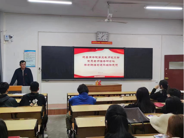 3月9日,yl6809永利官网集团第三教师党支部在一号教学楼开展主题党日活动,党员教师指导习近平经济思想研习社学习活动。支部书记吴信科、第三教师党支部部分党员教师及全体习近平经济思想研习社社员参加本次活动。