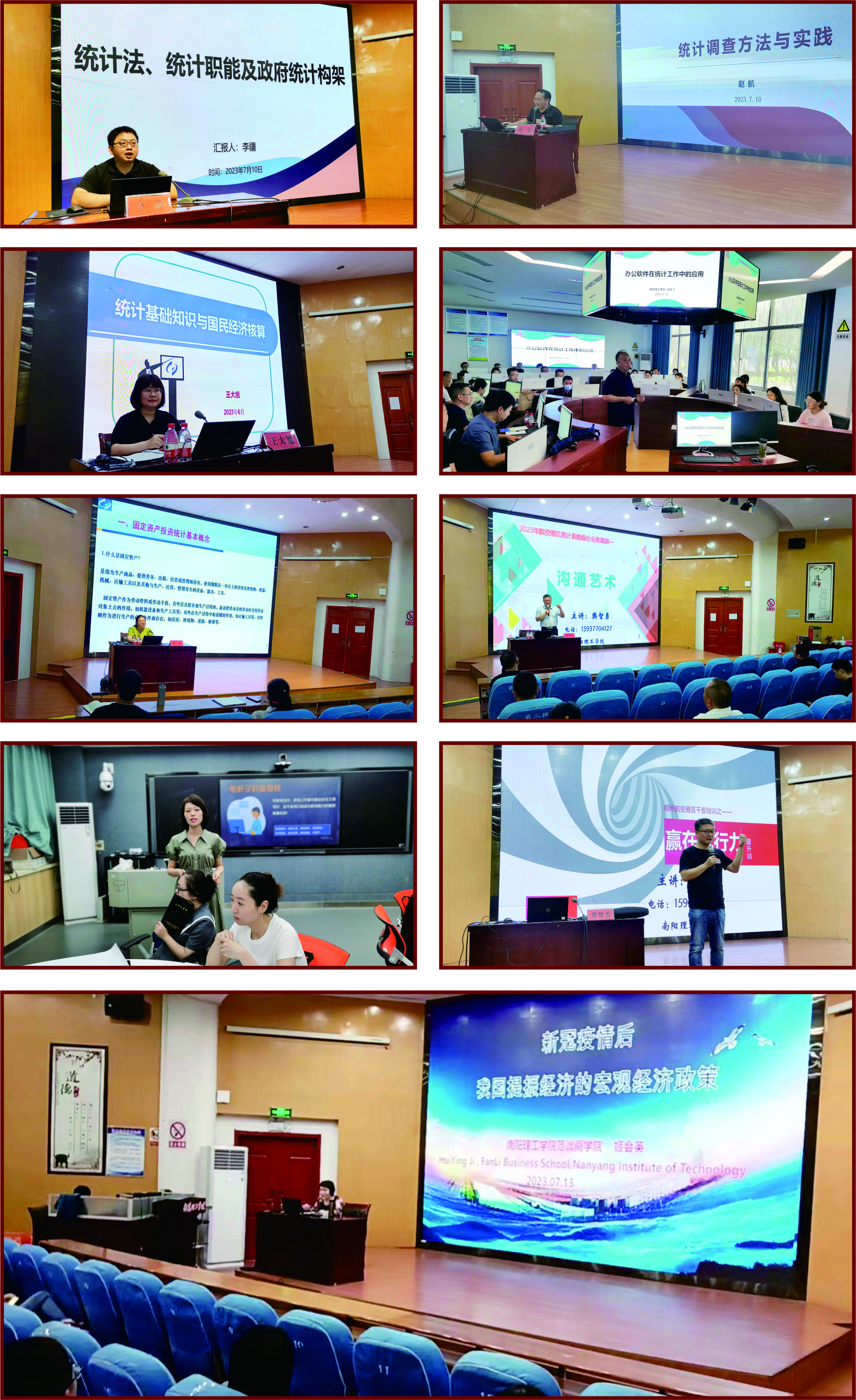 本次培训,业界专家郑州市统计局设管处处长李疆,张衡科技文化园书记、主任高级统计师王大旭,卧龙区统计局统计师梁爽分别作了主题为《统计法、统计职能及政府统计构架》《统计基础知识与国民经济核算》《固定资产投资统计工作》的专题培训,校内专家yl6809永利官网集团骨干教师赵航、刘新飞、樊智勇、姬会英、李玉分别作了主题为《统计调查方法与实践》《办公软件在统计工作中的应用》《沟通艺术》《赢在执行力》《公文写作》《新冠疫情后我国提振经济的宏观经济政策》的专题培训。