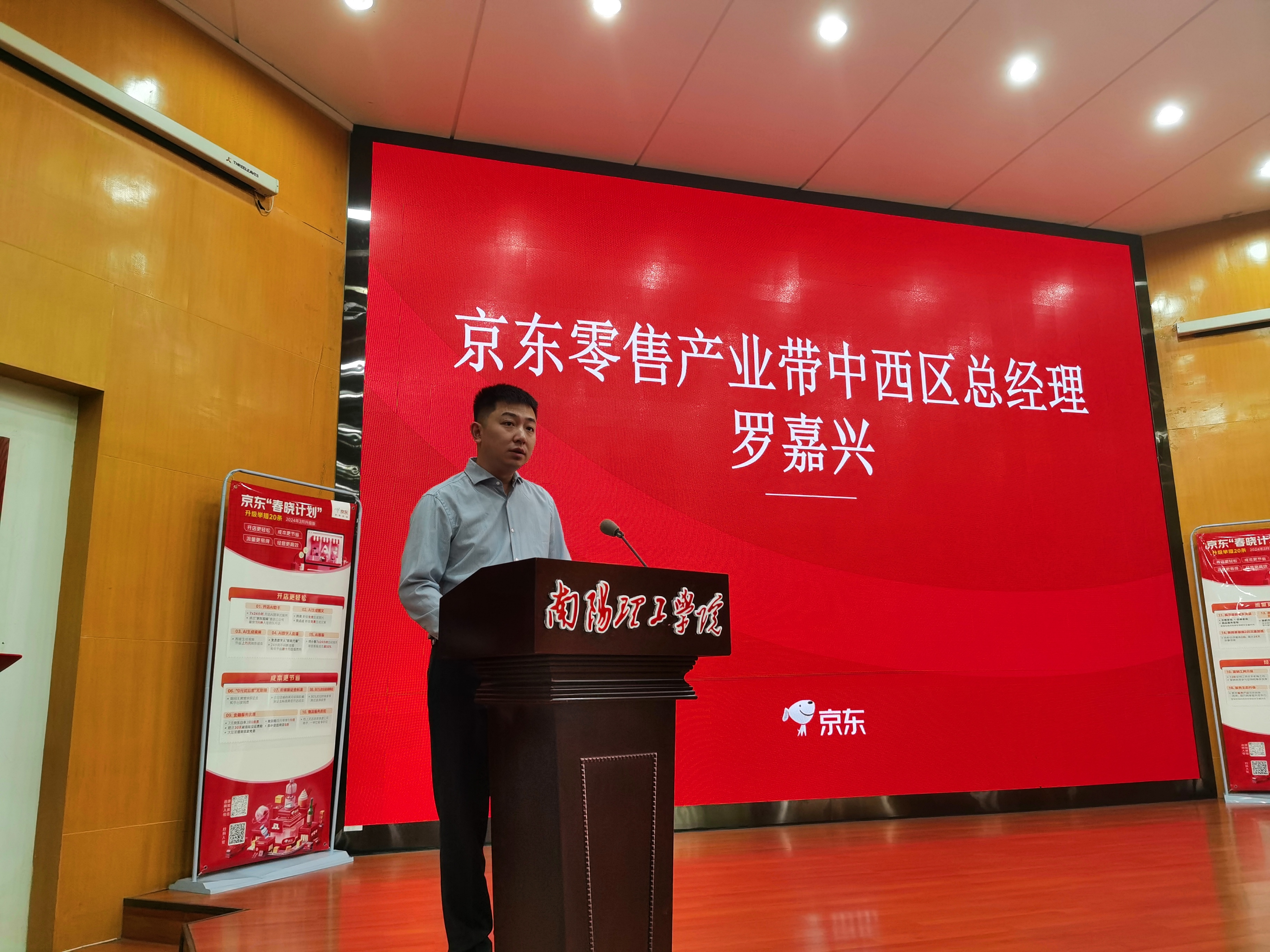 本网讯(特约记者/李浩)5月27日,“京东特色产业带集群中国行·走进南阳暨产业带高质量发展峰会”暨商圣大讲堂第四十一期在我校成功召开。南阳市商务局副局长牛犇、电子商务科科长包阳、电商发展中心主任孙中勋,京东零售产业带中西区总经理罗嘉兴,京东科技(南阳)有限公司总经理王宏喜,京东物流河南省区销售部平台业务负责人王静静,yl6809永利官网集团党委书记闫合占、院长郭永奇、副院长周青浮出席会议,会议由yl6809永利官网集团、yl6809永利集团新零售产业学院协办。