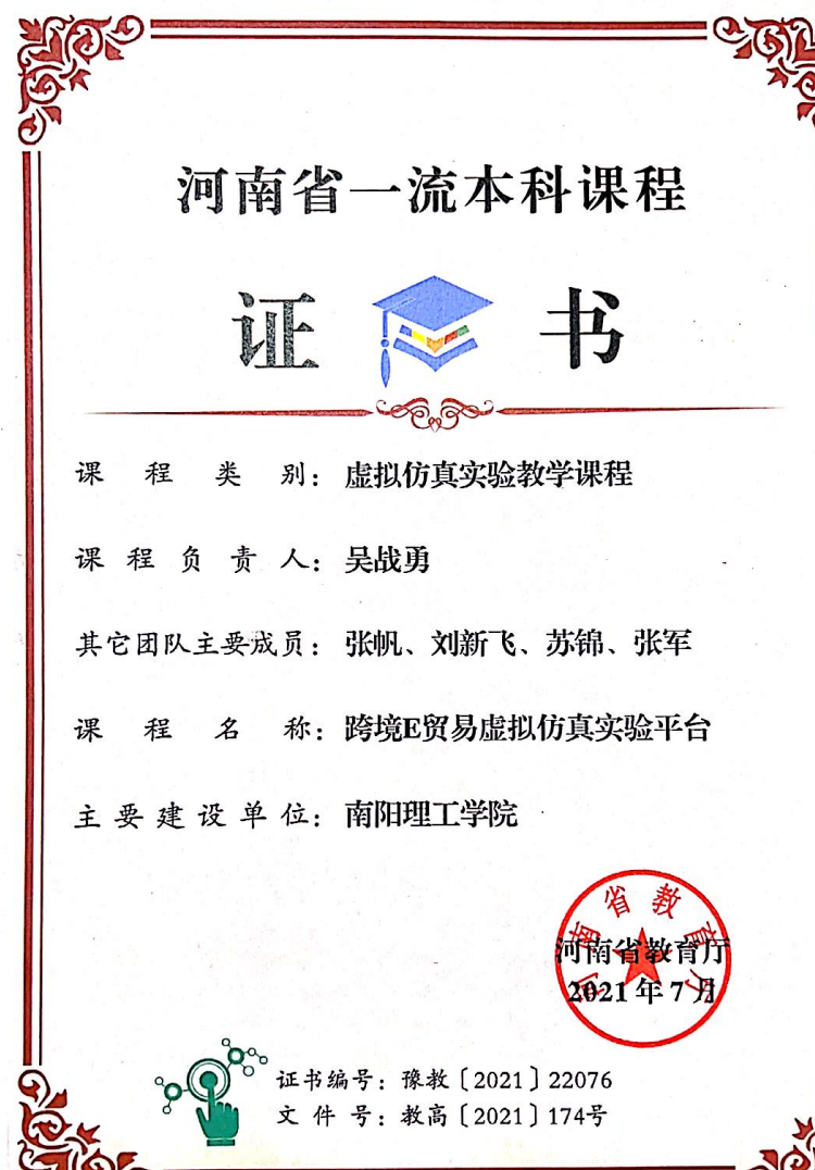 8 | 一流课程 | 跨境E贸易虚拟仿真实验平台 | 省级 | 2021.7 | 吴战勇 |