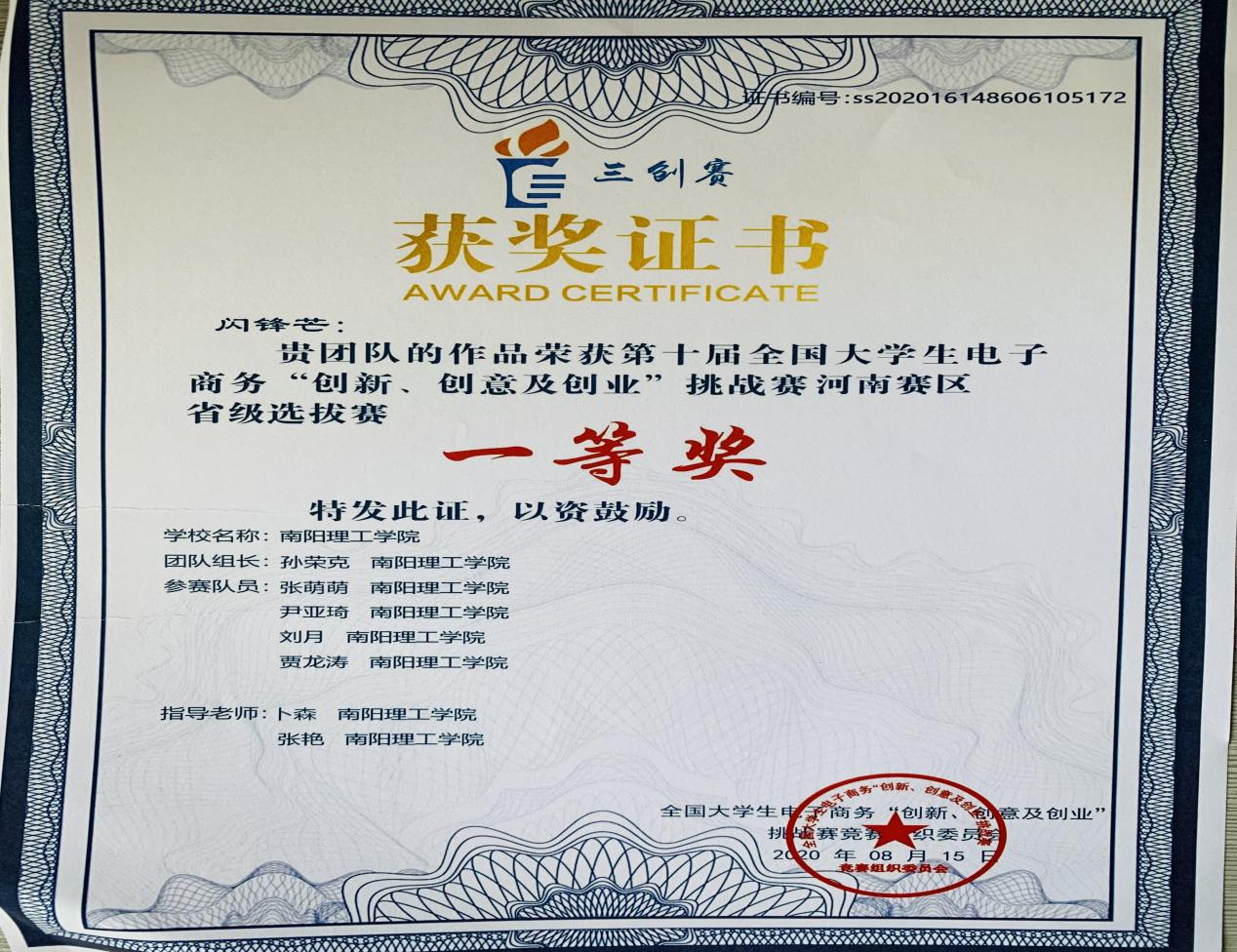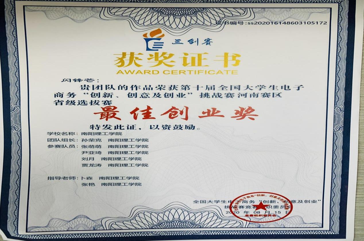 2020.8第九届全国大学生电子商务创新、创意、创业大赛最佳创业奖