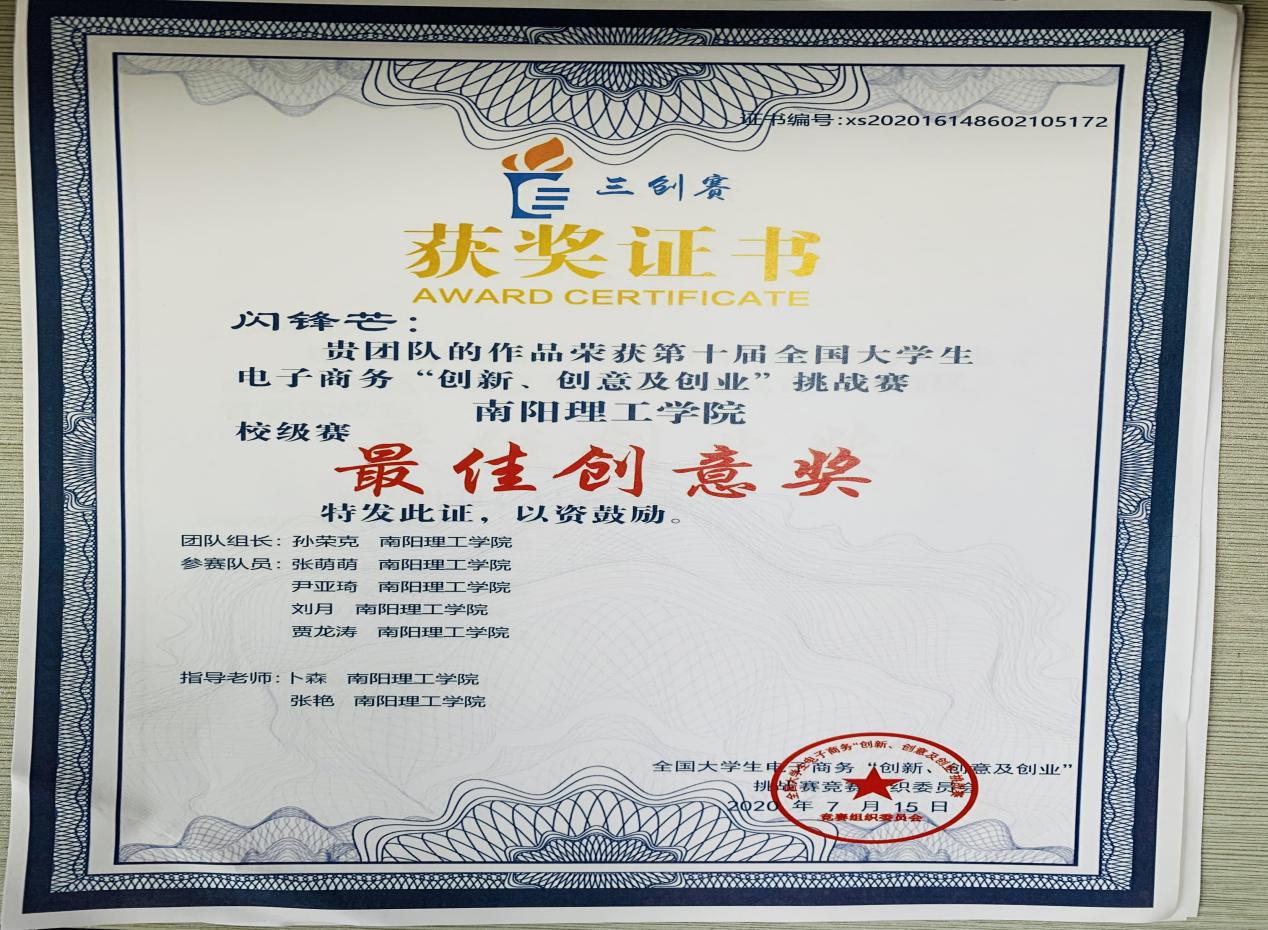 2020.8第九届全国大学生电子商务创新、创意、创业大赛最佳创意奖
