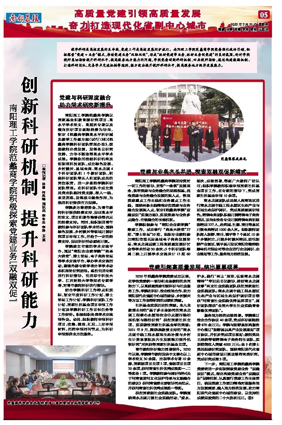 2020年yl6809永利官网集团党委成立以来,在学校党委统一领导和全体教师的共同努力下,以高质量党建引领科研与社会服务工作,学院在科研、校企校地合作、南阳副中心城市建设、乡村振兴等工作取得了明显的成绩和突破。下一步,学院党委进一步创新探索党建业务双融双促模式,深化构建党建业务双融双促保障机制,认真履行党建工作主体责任,确保党建工作更加精准对接服务地方发展需要,融入地方经济发展,融入南阳副中心城市建设,以优异的成绩迎接党的二十大胜利召开。