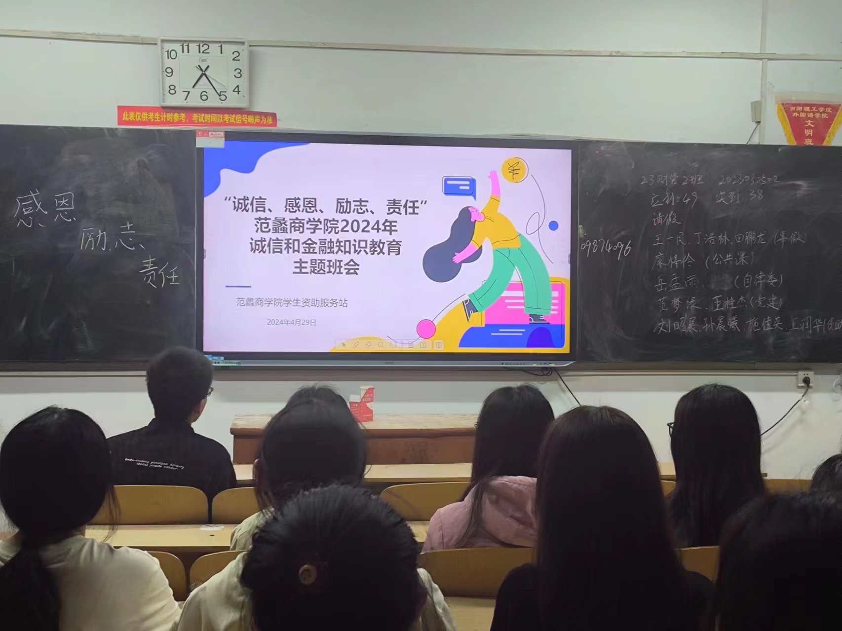 本网讯(通讯员/安俊丞)为深入贯彻党的二十大精神,提升全民金融素养,增强在校大学生的风险防范意识,扎实推进金融知识纳入国民教育体系的工作。同时增强我院学生辨别校园金融诈骗的能力,丰富大学生群体的金融知识。yl6809永利官网集团于4月29日举办“诚信、感恩、励志、责任” 2024年诚信和金融知识教育主题班会,学生资助服务站组织,大一各班同学参加。