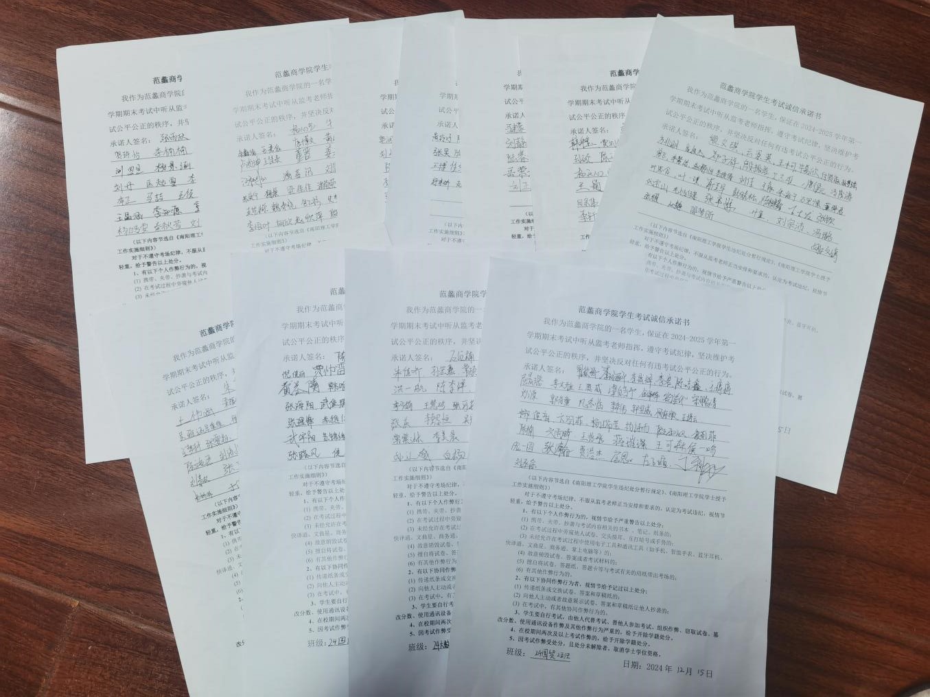 会议中,董博强调了诚信考试的重要性,讲明了考试违纪行为对学生的影响。他指出,要正确认识到考试是检验学习成果的最好机会和重要手段,它能让我们正确评价自己,找出学习上的失误和不足,在求学之路上不断进步。他要求,全体学生要充分做好考前准备,积极复习考试课程;要做到公平竞争,杜绝作弊行为;要严肃考风,诚信应考。同时,现场收了各班级签订的考试诚信承诺书。
