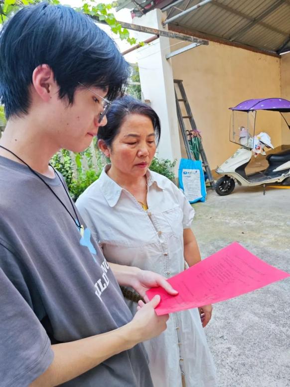 2024年8月,方冠在暑假期间回到了家乡河南省信阳市平桥区甘岸镇二郎村,带着对家乡的深厚感情,基于家乡经济困难的家庭对国家资助政策的了解有限,他作为国家资助政策的受益人,决定将了解到的资助政策“带回”家乡,为家乡的贫困家庭带去一份希望。