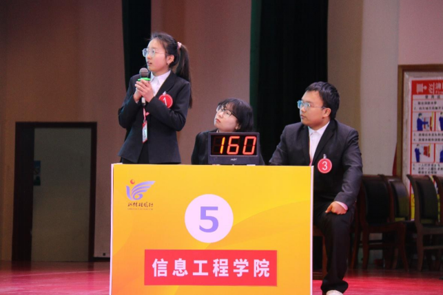 比赛现场,面对抢答题,选手们争分夺秒,在速度与沉着中上演了一场激烈的“头脑风暴”;风险题环节中,各小组认真思考,从容淡定。个人分工与团队协作的完美配合,赢得了在场观众的阵阵掌声。经过激烈的比拼,信息工程学院以170分暂列第一,外国语学院以160分暂列第二,土木工程学院以140分暂列第三,传媒学院以130分暂列第四,建筑学院以100分暂列第五。