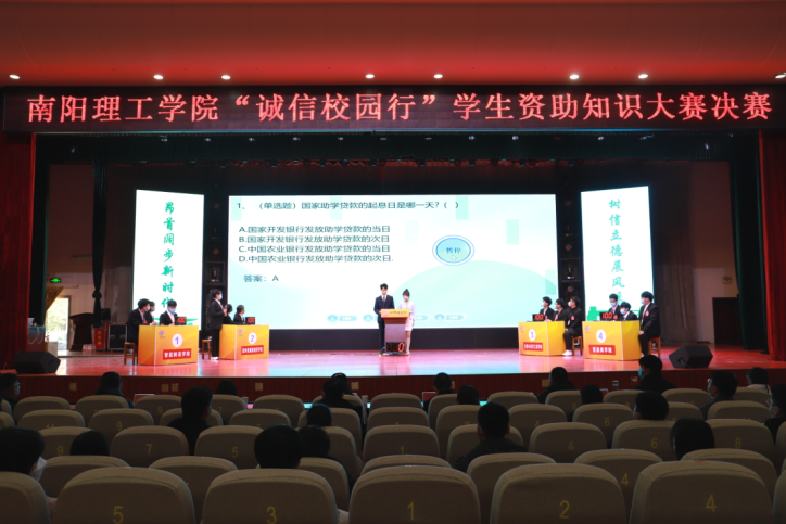 本网讯(通讯员/张清慈)为持续深入贯彻落实全国全省高校思想政治工作会议和全国全省教育大会精神,进一步营造诚信校园文化氛围,促使学生成为德才兼备、全面发展的人才,推动我校学生资助工作持续健康高质量发展。同时为省赛的顺利举办打好基础,做足准备。根据《河南省教育厅中国人民银行郑州中心支行中国银行保险监督管理委员会河南监管局国家开发银行河南省分行关于举办河南省大学生“诚信校园行”学生资助知识大赛的通知》(教资助〔2021〕327号精神),我校于3月22日下午成功举办yl6809永利集团大学生“诚信校园行”学生资助知识大赛第一组决赛。