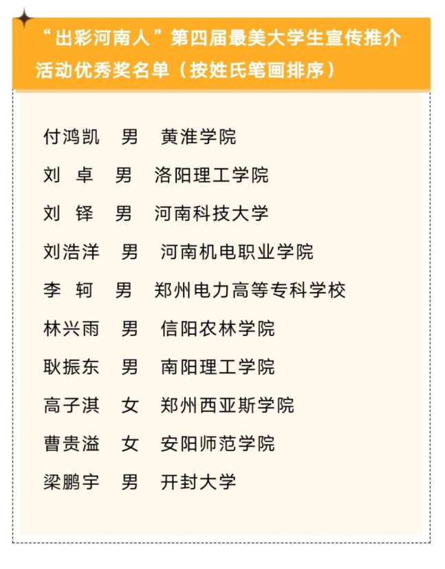 据了解,“出彩河南人”第四届最美大学生宣传推介活动历经学校推荐、专家初评、现场答辩、公众投票、组委会终评等环节。活动启动后,全省各高校高度重视,层层选拔,积极推荐,70所高校共推荐上报108件事迹材料。名单在组委会本着公开、公平、公正的原则终评后最终确定。
