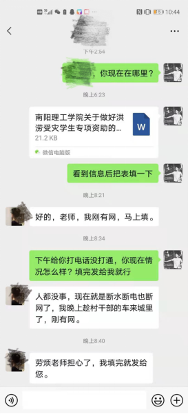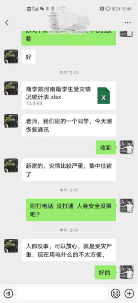 灾难无情人有情,面对此次暴雨洪涝灾害,学院各位辅导员尽其所能,了解、关爱每一位同学,做学生真正的知心人、热心人、引路人。大家众志成城,一定能取得防汛抗灾胜利!