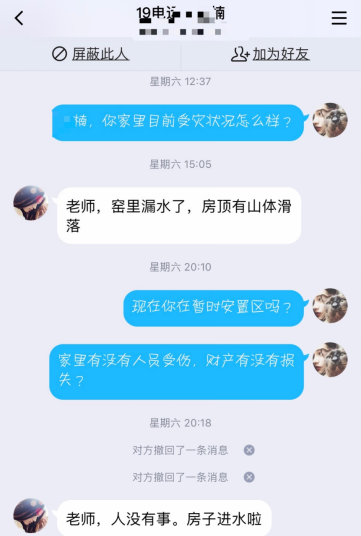 各年级辅导员老师通过电话、微信、qq等多种形式联系受灾地区同学,逐一询问同学情况,安抚同学情绪。对于部分灾区断网的同学,辅导员代其填写紧急救助申请。同时,对于学院部分留校学生,通过辅导员、楼层长、宿舍长网格化管理制度,逐一排查留校学生名单,核对学生人数,做好防汛知识宣传。