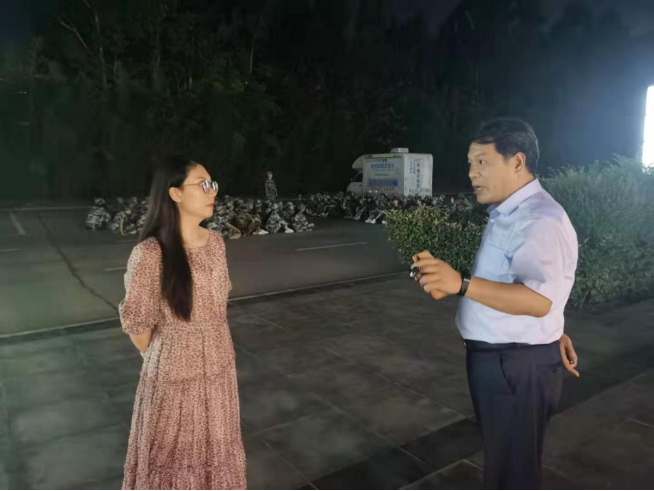 晚上张良到军训场与相关老师,就学生的身体状况进行交谈,并对参训学生的训练情况进行指导。
