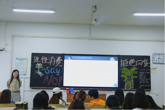 主题班会开始,主持人向同学们介绍了校园贷的具体类型,以及校园贷的危害。并引用真实的案例,进一步向大家阐明了校园贷所带来的深刻影响及严重后果。