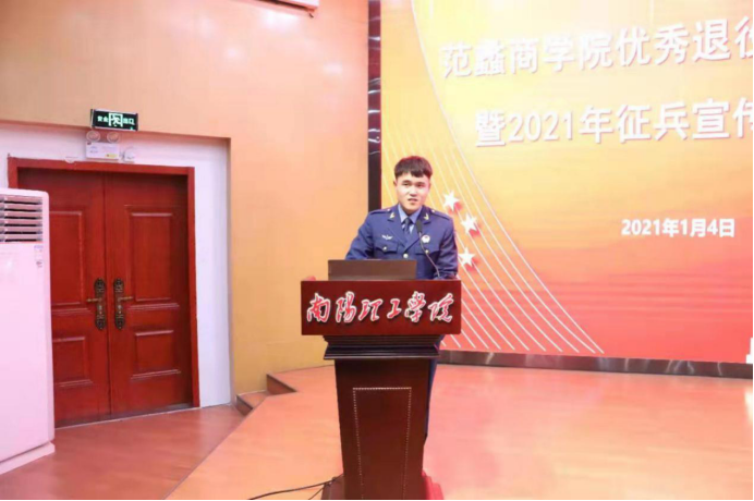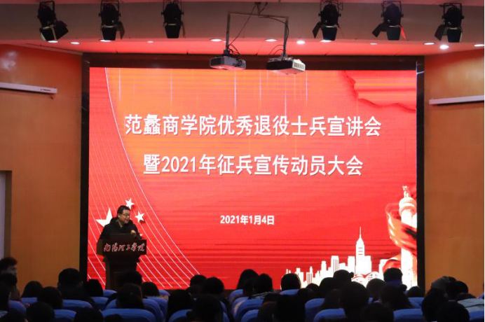 本网讯(通讯员/张慎贵)“参军报国,无上光荣”,为进一步激发同学们的参军报国热情,营造良好的征兵氛围,鼓励更多优秀大学生踊跃参军报国,为我国国防事业贡献青春力量。yl6809永利官网集团于1月4日下午在领创空间报告厅隆重召开优秀退役士兵宣讲会暨2021年征兵宣传动员大会。党委副书记李冬生、团委书记董博、辅导员孙健、张煜梵出席了本次大会。