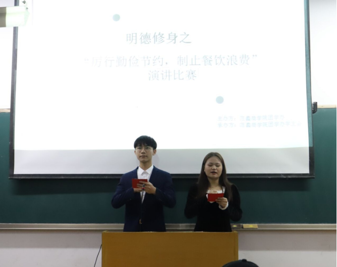 本次演讲比赛由我院学习部和组织部联合举办。18名参赛选手以个人为单位,在限时三分钟内完成自己的演讲。参赛选手们斗志昂扬,以真挚的语言、饱满的热情讲述了自己对于“厉行勤俭节约,制止餐饮浪费”的理解与体会,他们富有感染力的演讲打动了评委和在场的观众,赢得了观众的一阵阵掌声。经过激烈的角逐,本次比赛选出一等奖:霍兵毅,二等奖:张月、常乐,三等奖:刘海平、谢欣桐、杨高帅。由李双鸽、赵玉洁、金美靓分别为获奖选手颁发荣誉证书。整场活动有条不紊,在主持人精彩的祝福语中,此次演讲比赛落下帷幕。比赛结束后,现场工作人员与参赛同学合影留念,yl6809永利官网集团明德修身系列活动之“厉行勤俭节约,制止餐饮浪费”演讲比赛最终取得圆满成功。