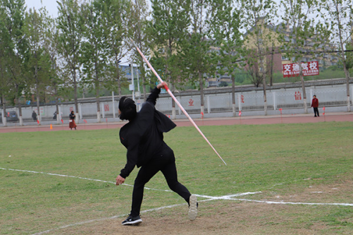 比赛开始,运动员们在裁判的监督下依次进行投掷。我院运动员张宏恩积极做好热身准备工作。随着裁判一声令下,他起步,助跑,将全身力量集中于右手,奋力一掷,标枪在空中划出一道漂亮的弧线,飞速落下,他的动作吸引了全场的目光。