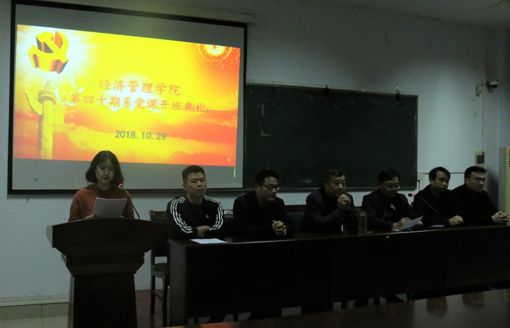 )10月29日,经济管理学院在9224会议室举办第40期系党课开班典礼,并进行第一节党课培训。参与本次开班典礼的领导有经济管理学院院长姜保雨,团学办主任田进军,辅导员赵明铎、孙健、袁健、董博。我院120余名同学参加了本期党课。