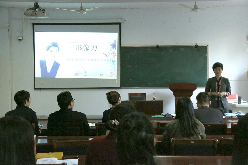 李飒凭着自己丰富的阅历,给学生讲解及分析了许多知名人士形象改变的案例,提醒大学生职场应聘成功与否都和形象有着很大的关系。她还选取了几位老师和学生作为例子向大家展示服装发型搭配的重要性。最后,她提出会亲自帮助一位学生和一位老师改变形象,大家踊跃参与。