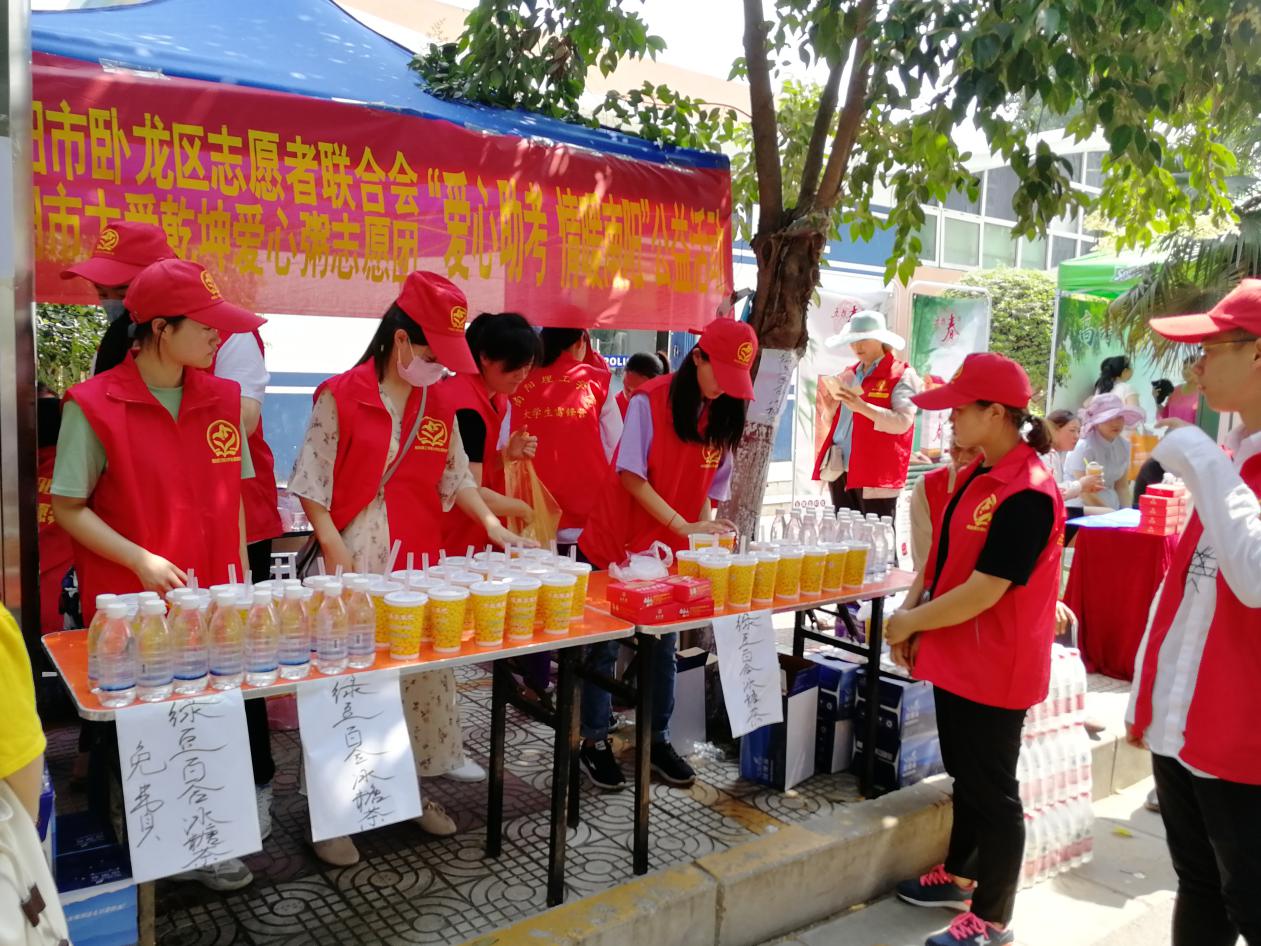 在南阳市一中考点,志愿者们协助南阳市卧龙区志愿者联合会及南阳市爱心粥协会的志愿者,一起搬运物资,并将绿豆粥分装成杯。天气炎热,考生家长们等候在考场外如坐针毡,志愿者们为考生家长送去绿豆粥及矿泉水,借此舒缓家长们的焦躁心情;同时,志愿者们又给一直坚守在岗位上的特警,交警,门卫保安等勤务人员送去爱心粥。考试结束时,志愿者们在门口列队等候考生,为他们加油助力。