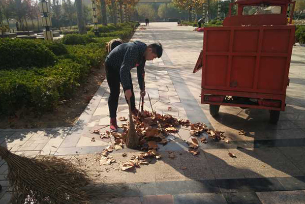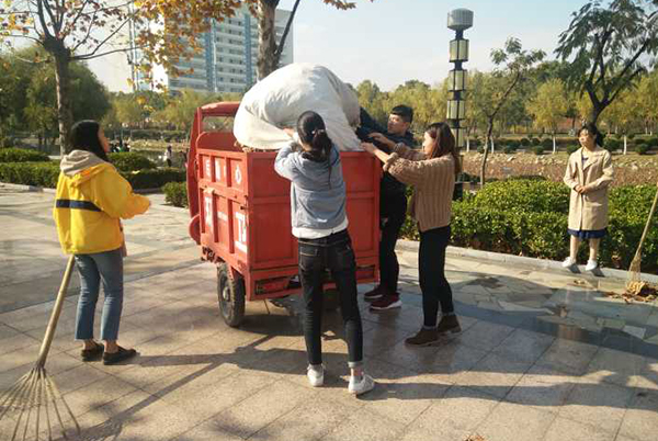 学生志愿者在负责人郭欢欢、何梦阳的带领下分成五个小组,前往书香园、梦溪湖、毓秀园,未来大道(西路)、药物种植园等五个地方协助后勤工作人员进行垃圾清扫工作。上午天气清冷,但志愿者们却热情高涨,认真仔细地清扫树林中的树叶,拾捡草丛中的垃圾,并将垃圾装进垃圾车内。志愿者们互相帮助,共同完成任务,工作氛围十分融洽。