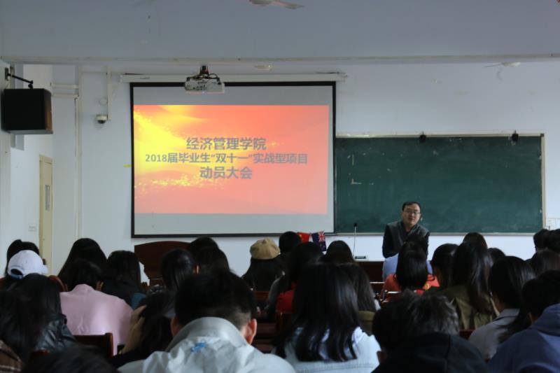 本网讯(学生记者/李翔宇)为了增强同学们实践能力,为毕业生提供实习锻炼的机会,10月31日,经济管理学院2018届毕业生“双十一”实战项目动员大会在9号楼224成功举办,本次会议由副院长姬定中主讲,带队老师赵明铎、袁健、董博、马媛及近100名毕业生共同参加。