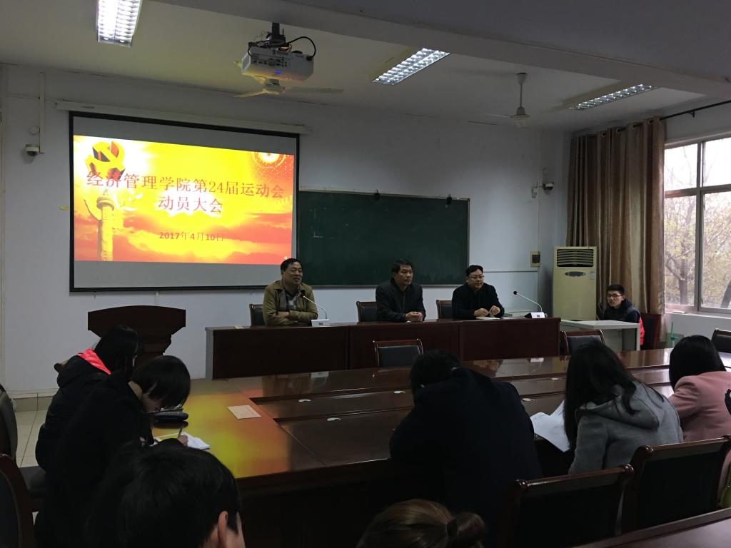 本网讯(学生记者/宋文涛 方丹飞)在我校第二十四届田径运动会即将到来之际,为充分调动运动员的积极性,同时确保运动会期间各项赛事及后勤保障服务工作有序进行,4月10日,经济管理学院在9教224会议室隆重举行运动会动员大会。经济管理学院党委书记张良、副书记林茂超、团学办主任田进军以及经济管理学院各年级辅导员出席本次大会。经济管理学院学生会全体干部和全体运动员参加了会议。