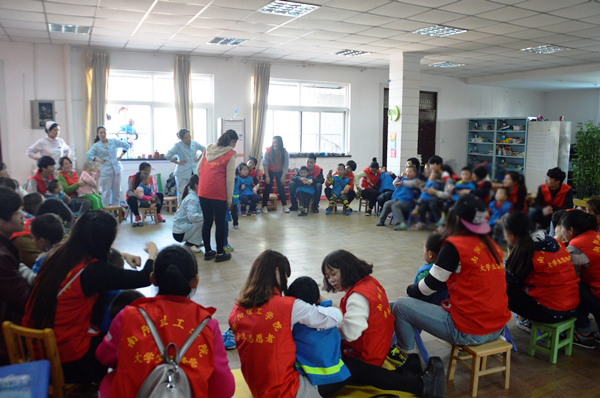 志愿者到达医院后,听从医护人员的指挥,在医护人员的帮助下,一对一的与自闭症儿童组成搭档,围坐在一起,形成了一个圆圈。带领孩子们练习他们的教程,听音乐传皮球。