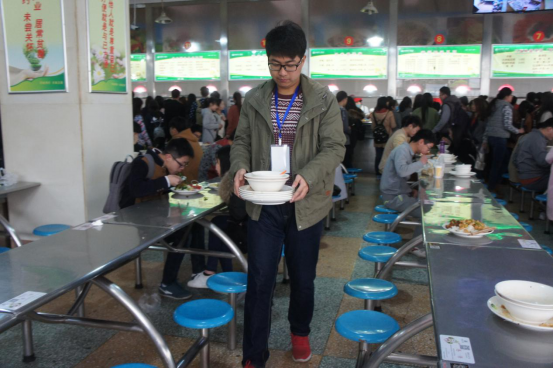 中午十二点,志愿者在餐厅指定区域,监督学生排队买饭、自觉清理餐具,并帮助餐厅卫生管理员回收餐具、清理剩余饭菜。在志愿者的带动下,不少就餐同学自觉度明显提高。志愿者纷纷表示,短暂的角色互换体验,也让自己有了不同的生活感悟,更能体会食堂卫生管理员的辛苦。希望同学们提高就餐文明素质,并尽自己绵薄之力为大家营造良好的用餐环境。志愿服务持续一天,在新老校区学生餐厅四个楼层同时进行,餐厅的卫生管理员对我们的志愿服务给予了极大的赞许,也十分感谢大家的志愿服务。
