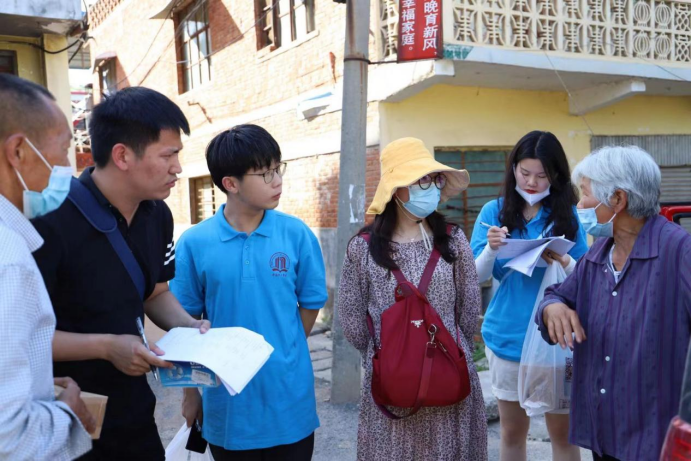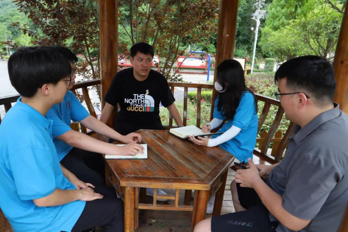 图为实践团队队员在寺湾镇和老师交流调研情况。