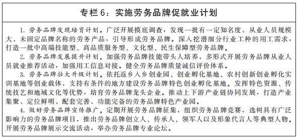 稳定和扩大农村劳动力外出就业规模。广泛开展区域间劳务协作,健全劳务输入集中区域与劳务输出省份对接协调机制,加强劳动力跨区域精准对接,发展劳务组织和经纪人,有序组织输出地农村劳动力外出务工。培育一批有地域特色、行业特征、技能特点,带动农村劳动力就业效果好的劳务品牌。实施农民工素质提升工程,推进新生代农民工职业技能提升计划。创建一批农村劳动力转移就业示范县。