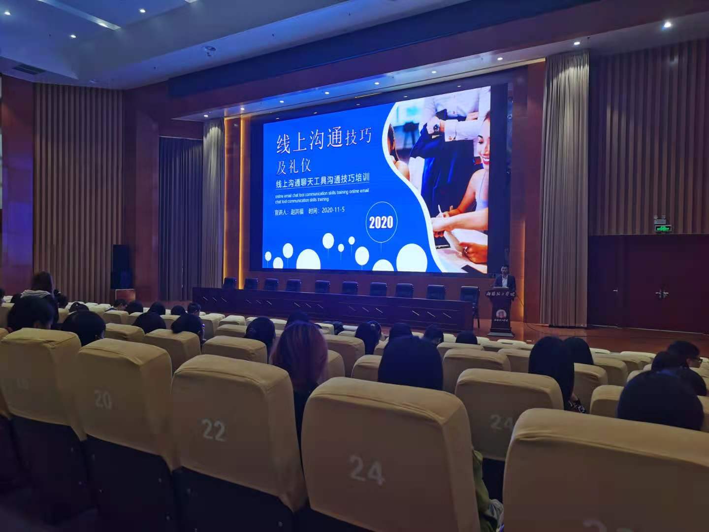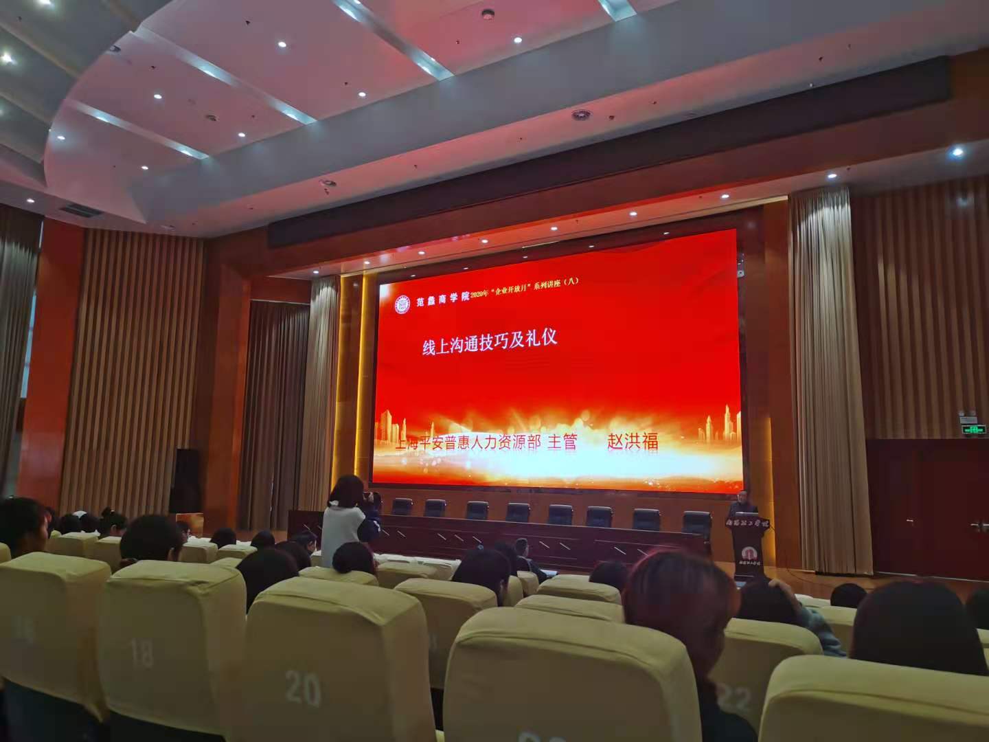 9:30-11:30上海平安普惠在1508宣讲和面试答疑;下午15:00-17:00在上海平安普惠人力资源总监赵洪福第三报告厅做了题为《线上沟通技巧和礼仪》的精彩报告,给同学们传授求职技巧,分享职场经验。