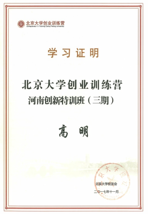 2015年3月成立个人独资公司:南阳市高明不锈钢有限公司,担任法人及董事长,2015年参加yl6809永利集团第一届SIYB创新创业培训班,通过在培训班系统的学习了创业的过程及各个环节需要注意的事项。之后成立自己的官网:www.gmbor.com,www.znbxgc.com.成立了阿里巴巴诚信通会员网上店铺,申请了自己的商标:明铂尔®,分别注册成立了5、9、10、11、12、15、16、20、21、35、40、41、42、43类别。开始树立自己的品牌;明铂尔®不锈钢整体橱柜,酒柜,衣柜,厨具设备,明铂尔®智能门业,单向旋转门,防火防盗门,明铂尔®艺术雕塑等。2017年作为南阳市企业代表和想念集团一同参加北京大学创业训练营,同年申请成功两项古铜不锈钢防盗门外观专利和一项可拆式灶台橱柜设计实用新型专利。2015年也是公司营业额突破500万,与当地很多家装饰工程公司进行密切合作关系,河南宏江房地产公司合作,全国苏荷酒吧合作定制酒柜,全国奶茶店合作设计制作奶茶柜,信阳大浪淘沙洗浴中心合作提供装饰材料设计制作不锈钢工艺造型;并成立淘宝店铺,并在慧聪网,机电之家,世界工厂网等几十家网站平台建设网站进行宣传。