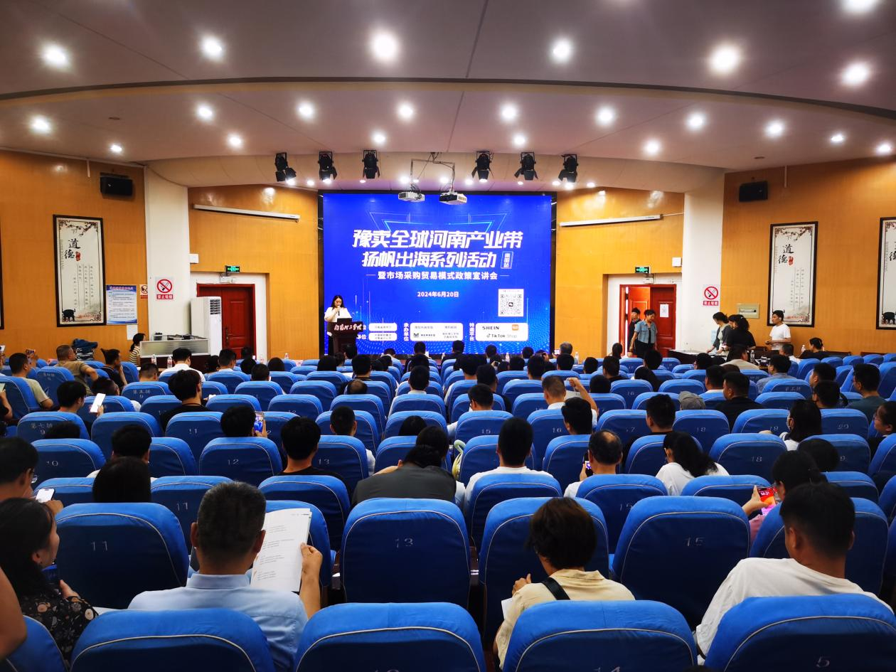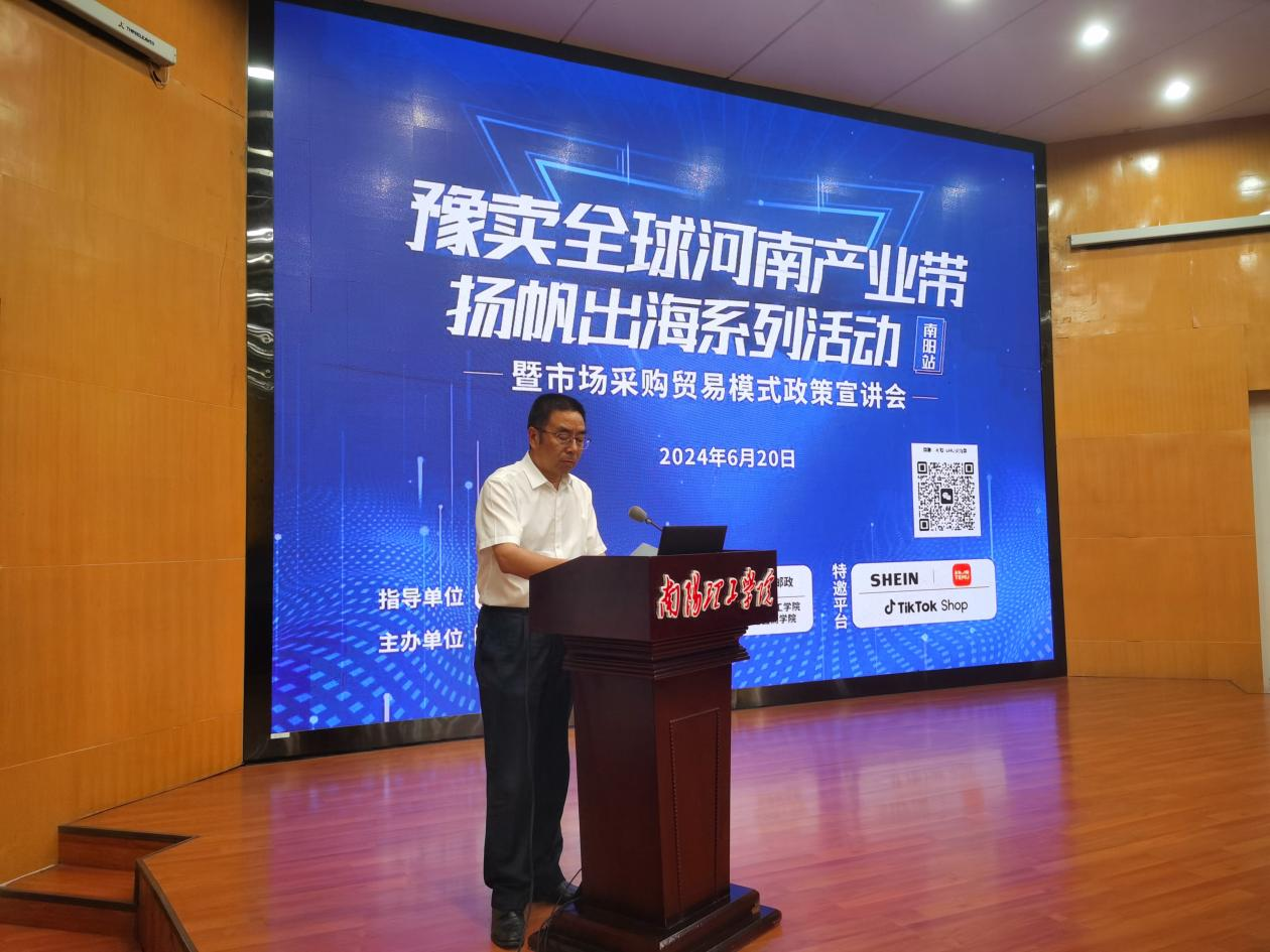本网讯(特约记者/李浩)6月20日,“豫卖全球河南产业带扬帆出海系列活动(南阳站)暨市场采购贸易模式政策宣讲会”暨商圣大讲堂第四十三期在我校成功召开。南阳市商务局副局长牛犇、yl6809永利官网集团党委书记闫合占、中国邮政集团有限公司南阳分公司副总经理李庆、许昌市对外贸易综合服务中心招商引资部主任张亚辉、豫卖跨境联盟理事长李凯等出席会议,此次活动由yl6809永利官网集团承办。