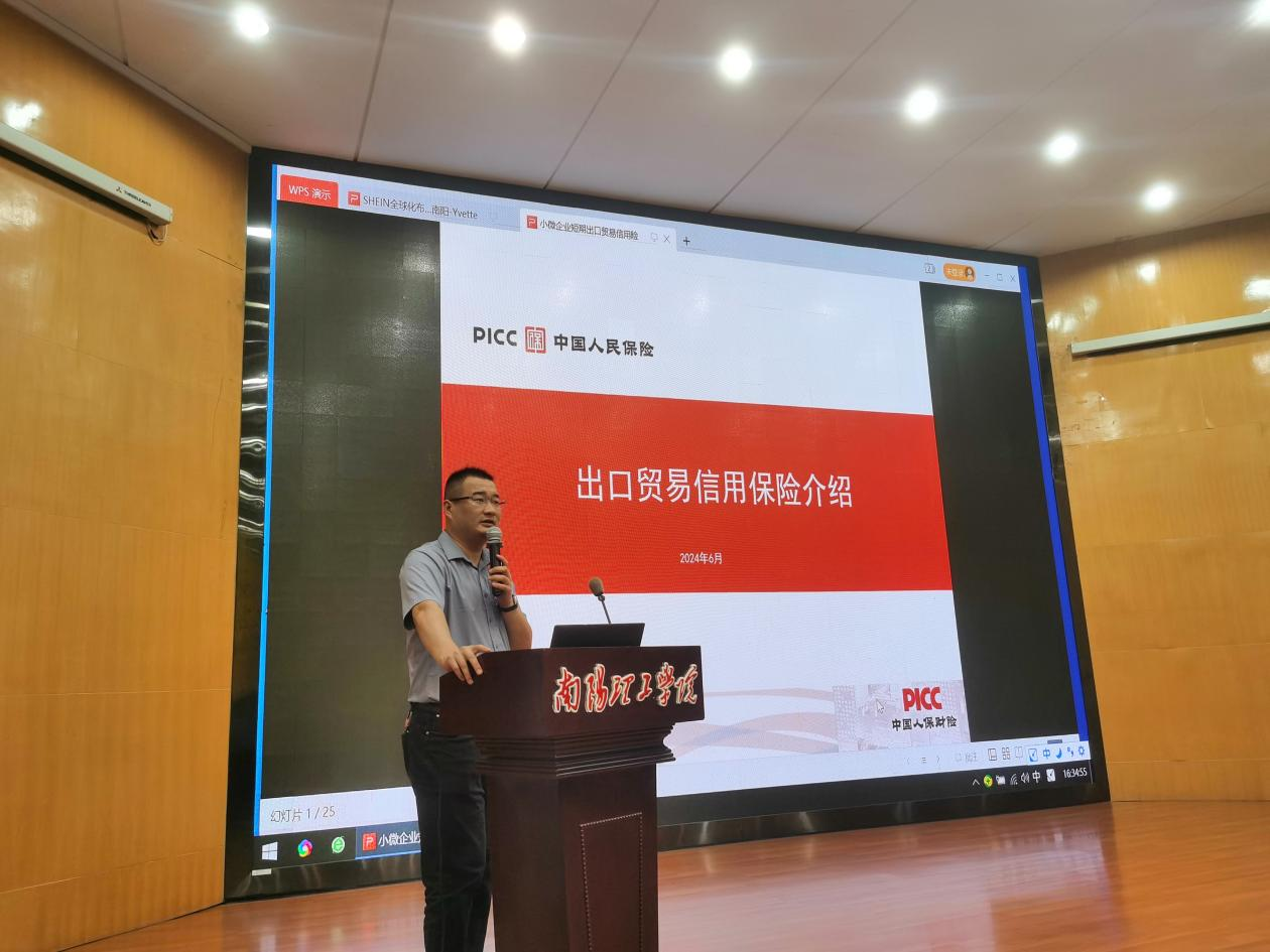 人保财险南阳市分公司副经理王帆做了主题为《企业出口信用保证保险业务为进出口贸易保驾护航》的报告。