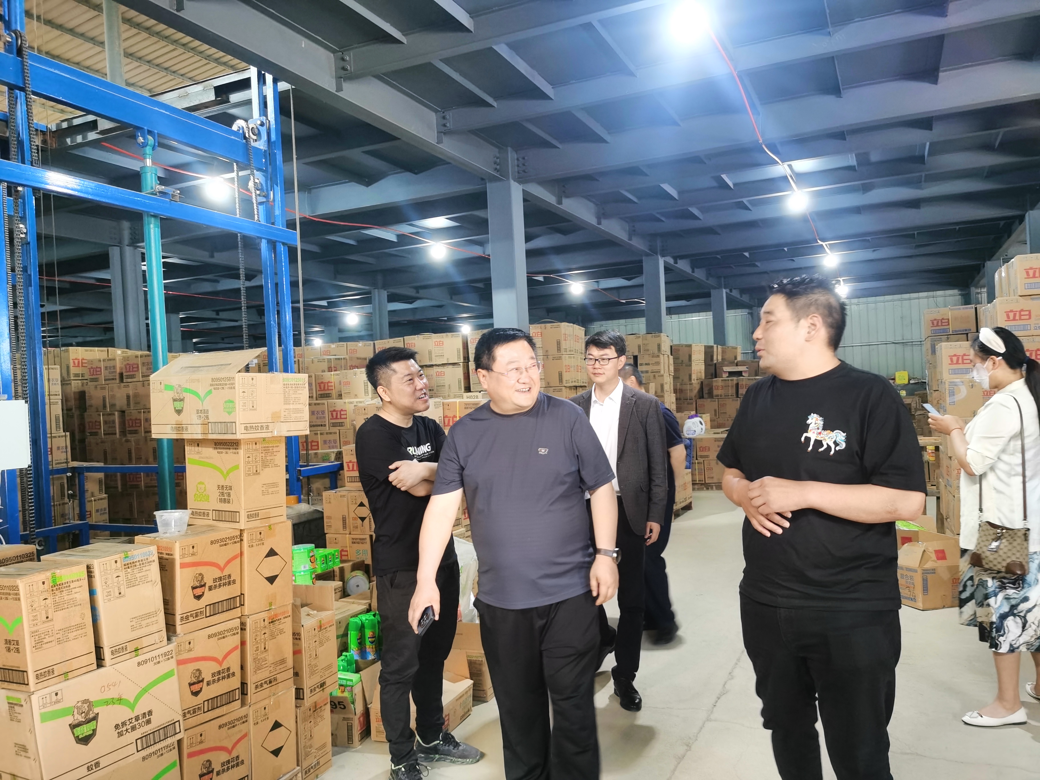 首先考察组深入考察了企业。在南阳市共盈实业有限公司董事长兼总经理吴天转、及其企业相关部门负责人的陪同下,yl6809永利官网集团考察组一行深入考察了电商直播间、商品陈列间、商品仓储室等企业现场。