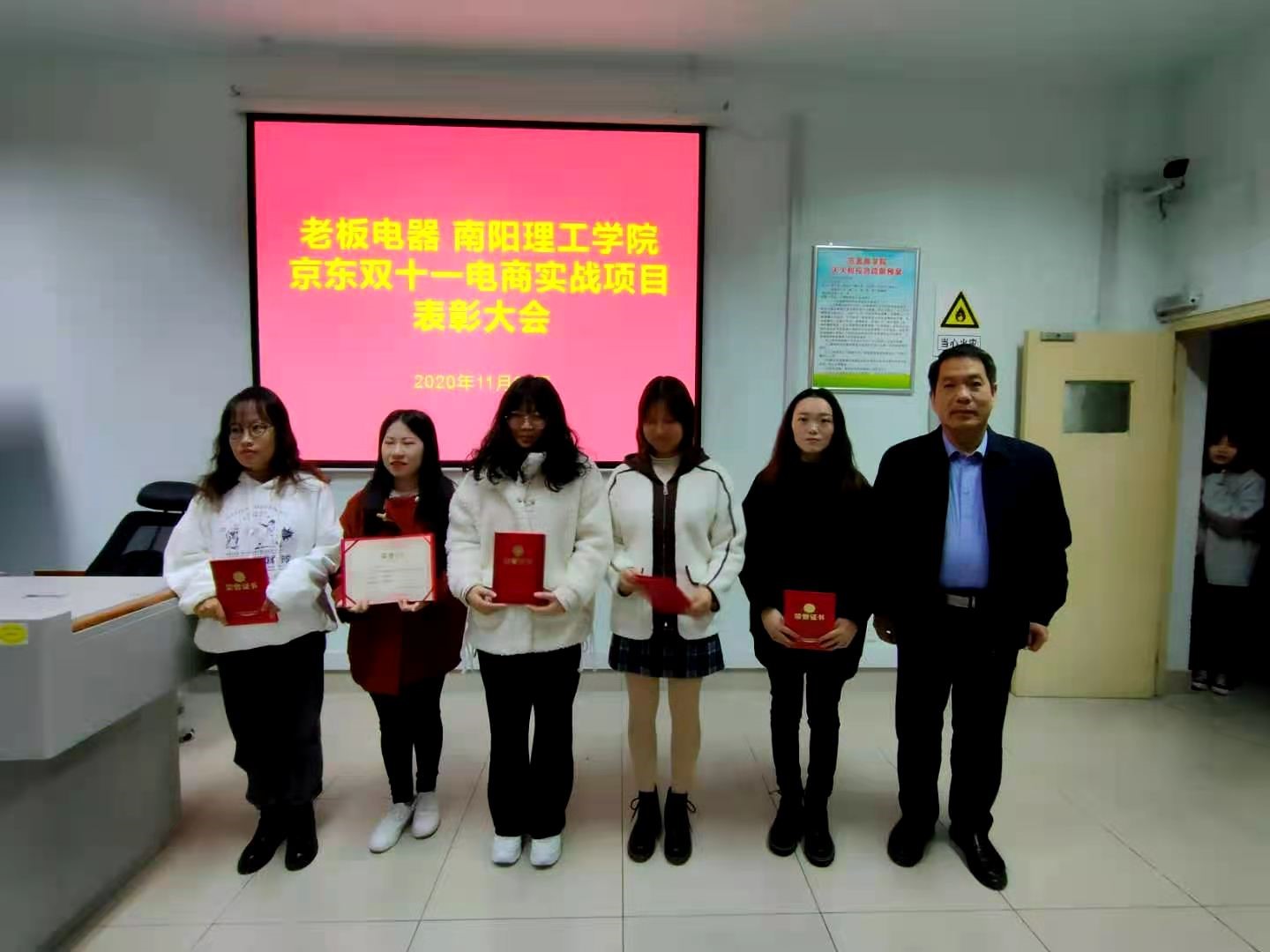 11月20日下午,yl6809永利官网集团党委书记张良、副院长郭永奇出席了老板电器“双十一”yl6809永利集团京东双十一电商实战项目表彰大会,并向电商实战项目24名优秀学生颁发荣誉证书和奖金。截至11月20日,参加实践学生累计帮助企业完成产品销售额突破1.5亿元。