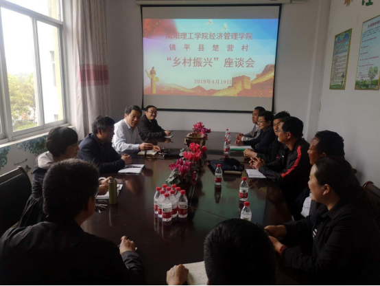 2019年4月19日镇平县张林镇楚营村申支书等一行五人在驻村第一书记南阳市接待办杨主任带领下,赴南阳市理工学院经济管理学院就“乡村振兴”工作进行洽谈交流。经济管理学院院长姜保雨、党委书记张良、副院长姬定中、李晓霞及部分老师参加了本次座谈会。