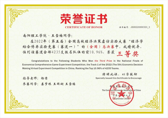 在中国商业经济学会主办,深圳北理莫斯科大学承办的2022年第五届全国高校经济决策虚拟仿真实验大赛中,由王阳老师指导的陈天玉、李子昂参赛团队,张慧老师指导的徐文旭、刘晓峰、陈康参赛团队均荣获省级二等奖。张慧老师指导的邓凤、杜瑞佳、刘重阳参赛团队,杨倩老师指导的吕欣悦、李博、田华艺参赛团队,娄梦珠、王雨娴、王雪楠参赛团队均荣获省级三等奖。