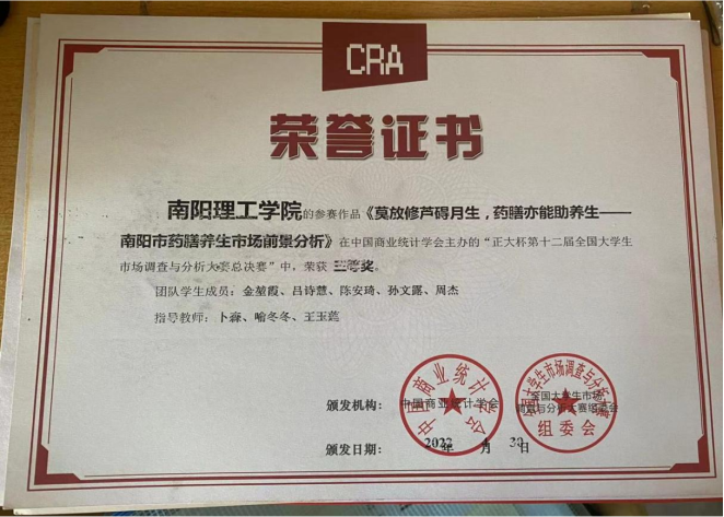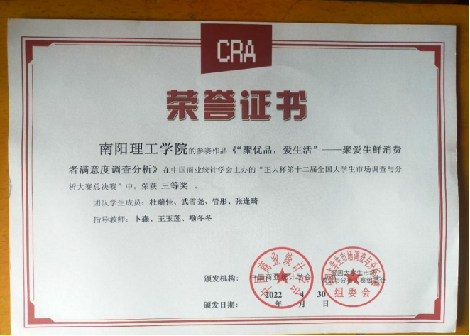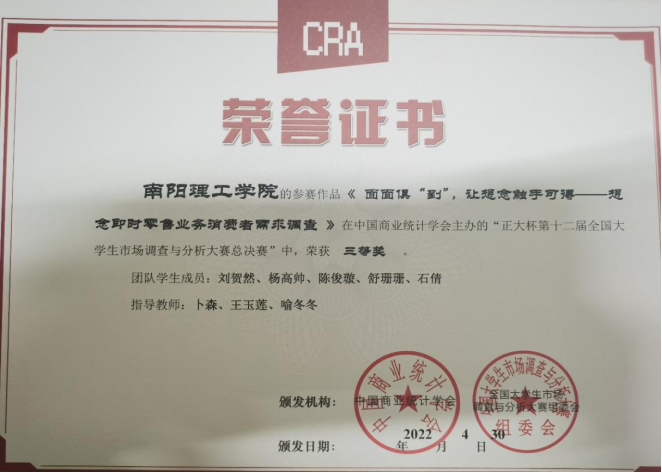 本网讯(通讯员/谢肖宇)2022年5月28-29日由中国商业统计学会、全国大学生市场调查与分析大赛组委会、教育部高等学校统计学类专业教学指导委员会中国商业统计学会主办,正大集团冠名的第十二届全国大学生市场调查与分析大赛成功举办,我院学生组队参加并获奖。