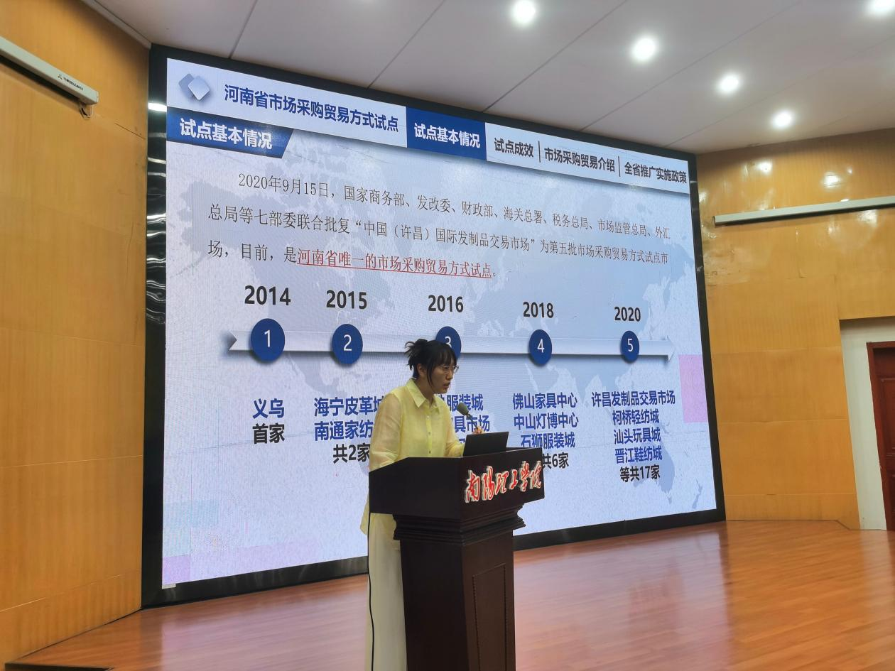 许昌市对外贸易综合服务中心综合办公室科员武雯斐做了主题为《河南省市场采购贸易方式试点业务推广》的报告。