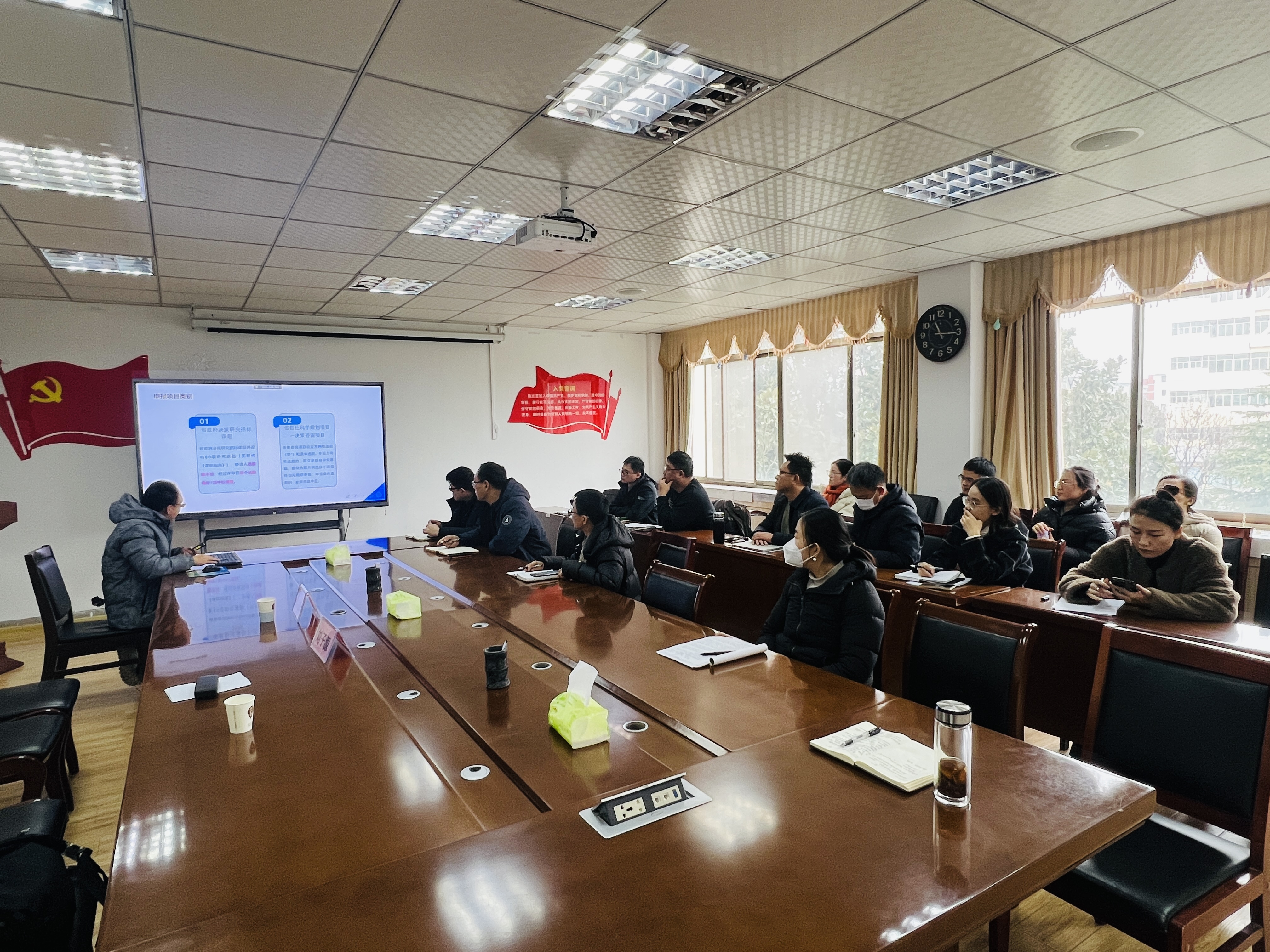 周青浮副院长介绍了目前学院科研上取得的成就,包括项目立项、发表学术论文及著作等。同时指出了当前学院科研工作中面临的挑战与机遇,鼓励学院博士不断攀登科技高峰,在高层次科研成果尤其是国家基金项目上不断突破自我。