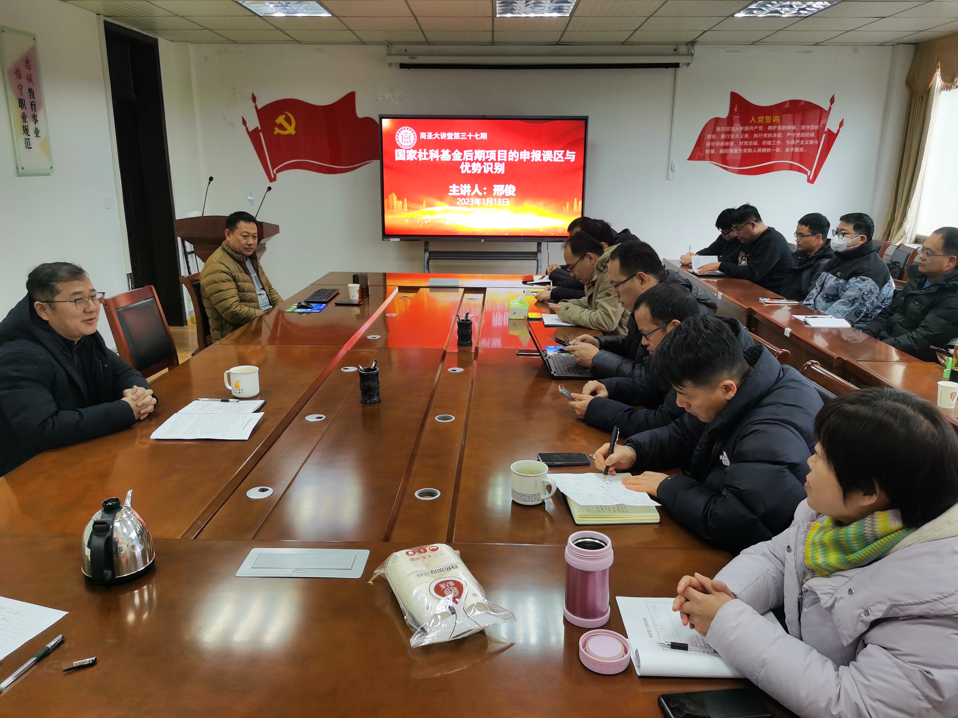 邢俊教授做了主题为《国家社科基金后期项目的申报误区与优势识别》的报告,围绕国家社科基金后期项目申报的项目解读、申报流程、认识误区、申报人资质、区域及个体优势、项目准备等重点方面,结合成功申报案例、心得体会和技巧方法等进行了系统、深入、生动的剖析和解读。会上,邢教授针对博士们关心的问题进行了深入的交流。