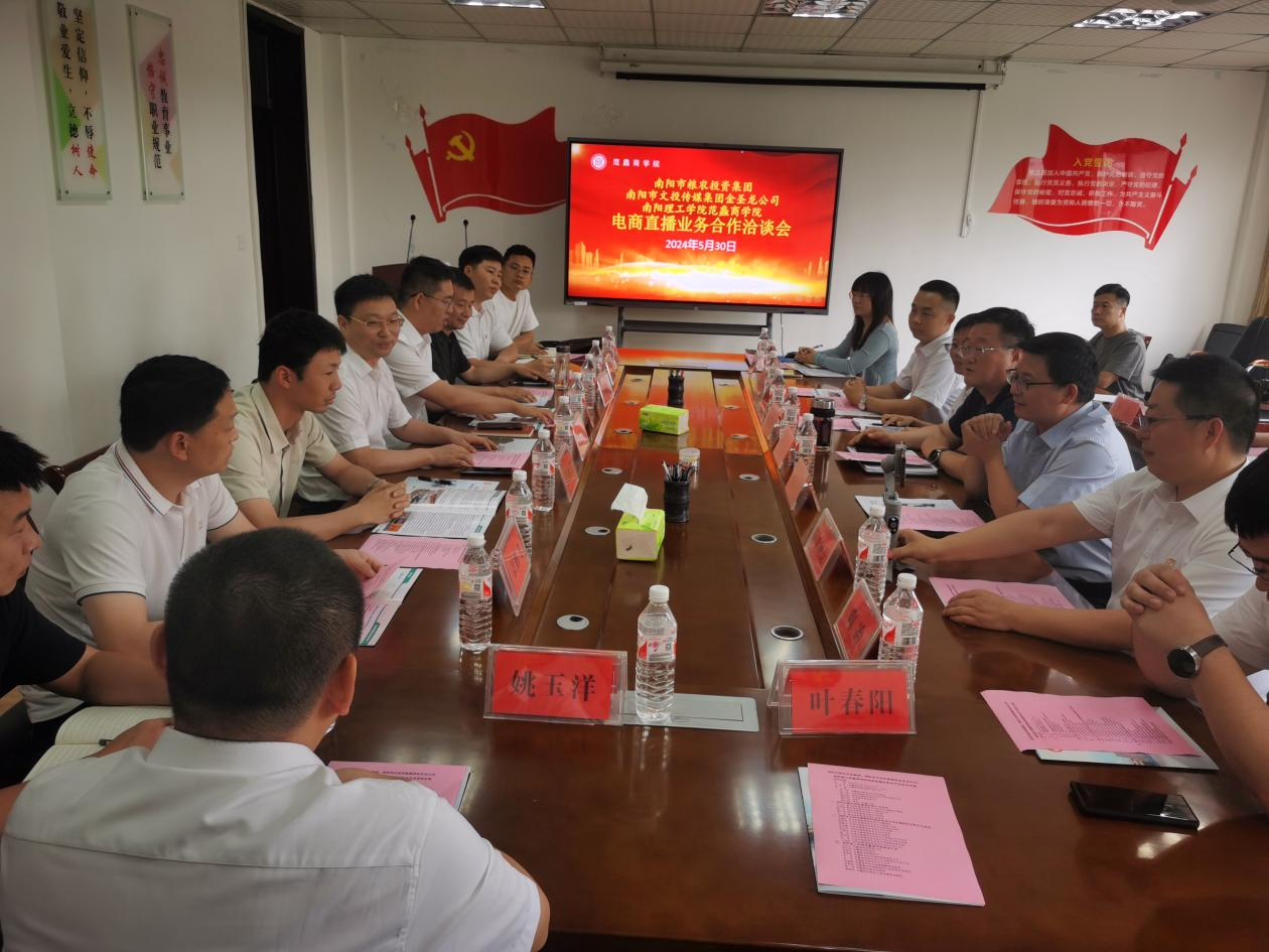 本网讯(特约记者/韩正)5月30日,南阳市粮农投资集团、南阳市文投传媒集团金圣龙公司、南阳理工yl6809永利官网集团电商直播合作洽谈会在yl6809永利官网集团会议室成功举行。南阳市粮农投资集团有限公司副总经理张新迎,南阳市文投传媒集团河南金圣龙文化传播股份有限公司董事长朱建房,yl6809永利官网集团党委书记闫合占、院长郭永奇出席会议,南阳市粮农投资集团有限公司、南阳市文投传媒集团河南金圣龙文化传播股份有限公司相关部门负责人、yl6809永利官网集团社会服务骨干教师等20余人参加了会议。