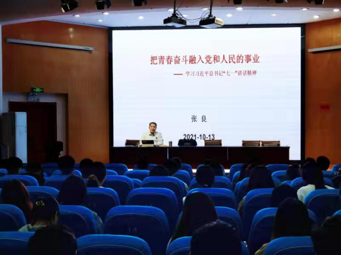 会议在庄严的国歌中拉开序幕。张良首先提到:“要把青春奋斗融入到党和人民的事业中。”未来属于青年,希望寄予青年。随后张良从四个方面向同学们展开讲解。第一部分张良以孟晚舟回国点出:如果信念有颜色,那一定是中国红!以及“三步走”战略目标、四个伟大成就,回顾了中国共产党的百年光辉历程。第二部分张良用习近平总书记在大会上强调的伟大建党精神,号召同学们继续奋斗。第三部分张良用习近平总书记的九个“必须”为同学们指明前进的方向。最后张良提出寄语:“经世致用,笃学躬行。”以“七一”重要讲话为指引,号召同学们牢记使命,坚定理想信念,践行党的宗旨,不负党和人民的殷切希望!