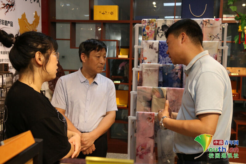 图为服务队负责人和扶贫馆负责人交谈。中国青年网通讯员 杨志豪 摄