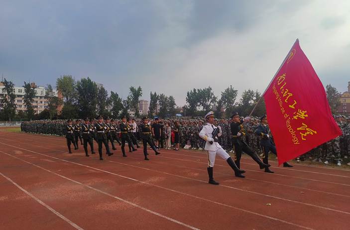 在庄严肃穆的国歌声中,典礼正式开始。全体军训教官迈着整齐的正步,护送校旗通过主席台,并进行队列和军体拳等军训课目展示。