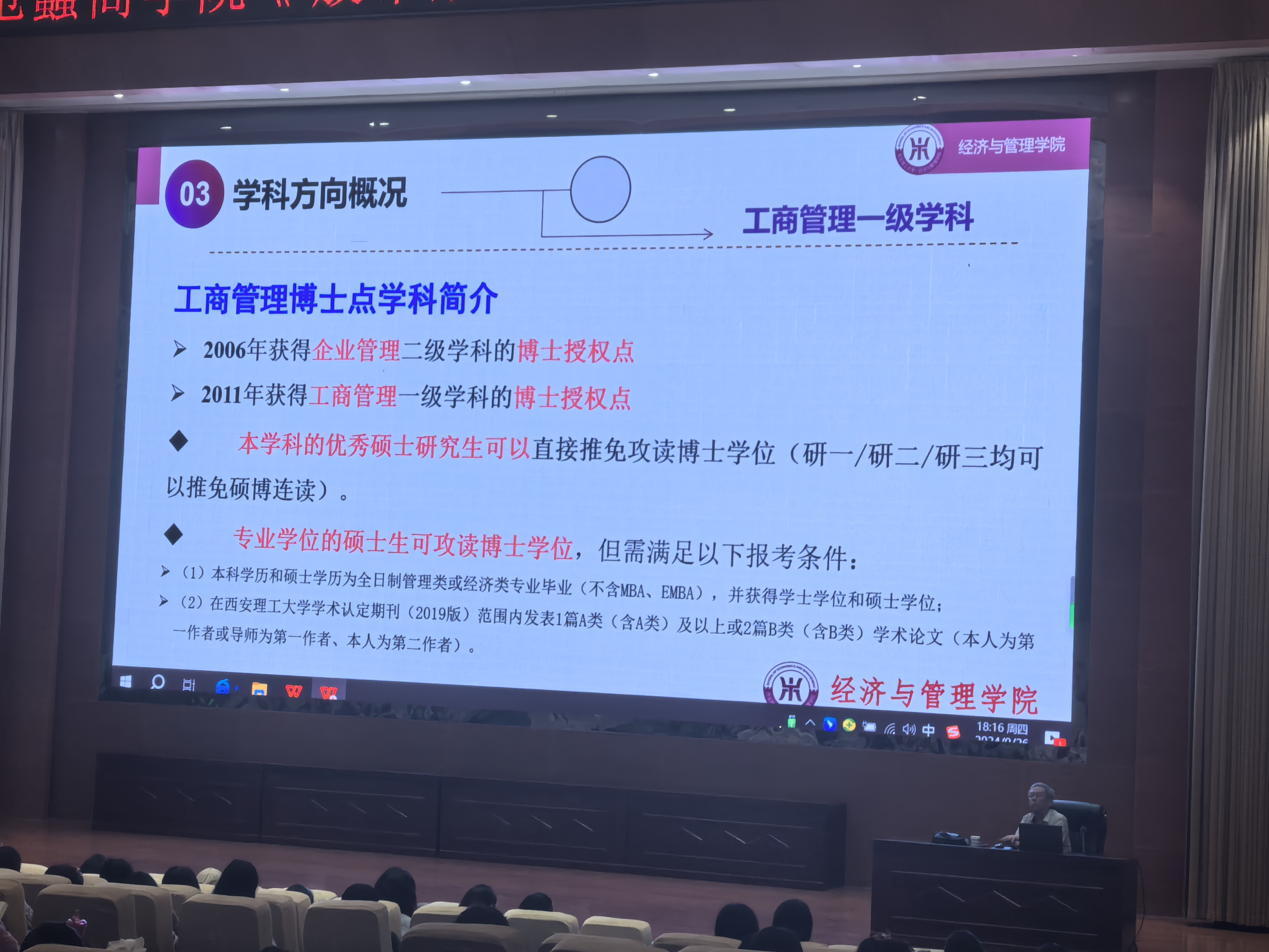 会上,扈文秀教授深入浅出地介绍了工商管理一级学科的发展历程及博士点学科的概况。他特别强调了西安理工大学在工商管理领域取得的显著成就,包括2006年获得企业管理二级学科的博士授权点,以及2011年进一步获得工商管理一级学科的博士授权点,这些成就不仅彰显了学校在该领域的强大实力,也为广大学子提供了更广阔的发展空间。